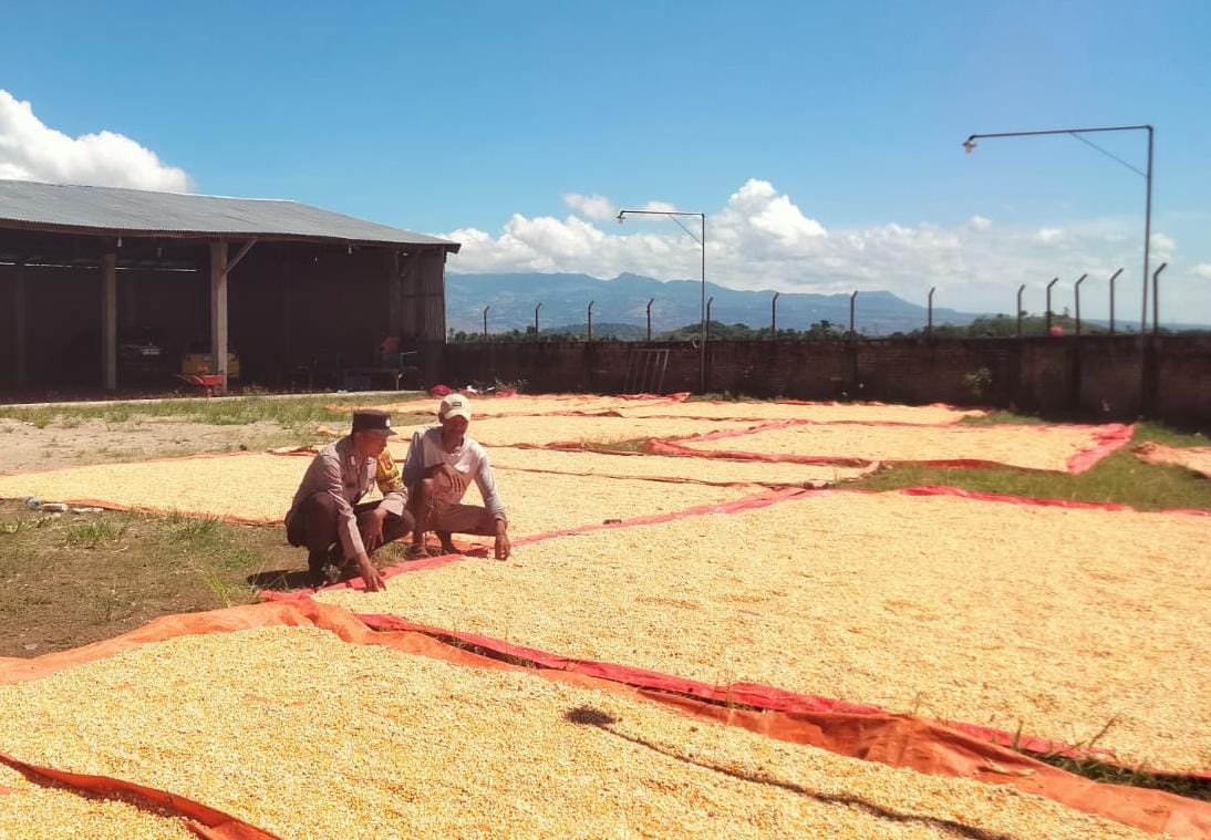 Bripka I Wayan Parwata Bhabinkamtibmas Polsek Woha Polres Bima Polda Sabtu 26 April 2025 menyambangi dan membantu proses penjemuran jagung warga binaan.