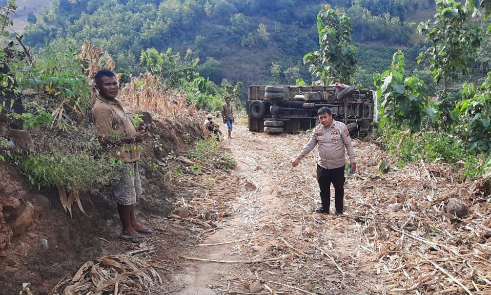 Truk yang dikemudikan supir yang berinisial B itu bermuatan Jagung seberat sekitar 4 Ton melaju di jalan ekonomi/jalan tani dari arah Desa punti menuju Desa Wadukopa,