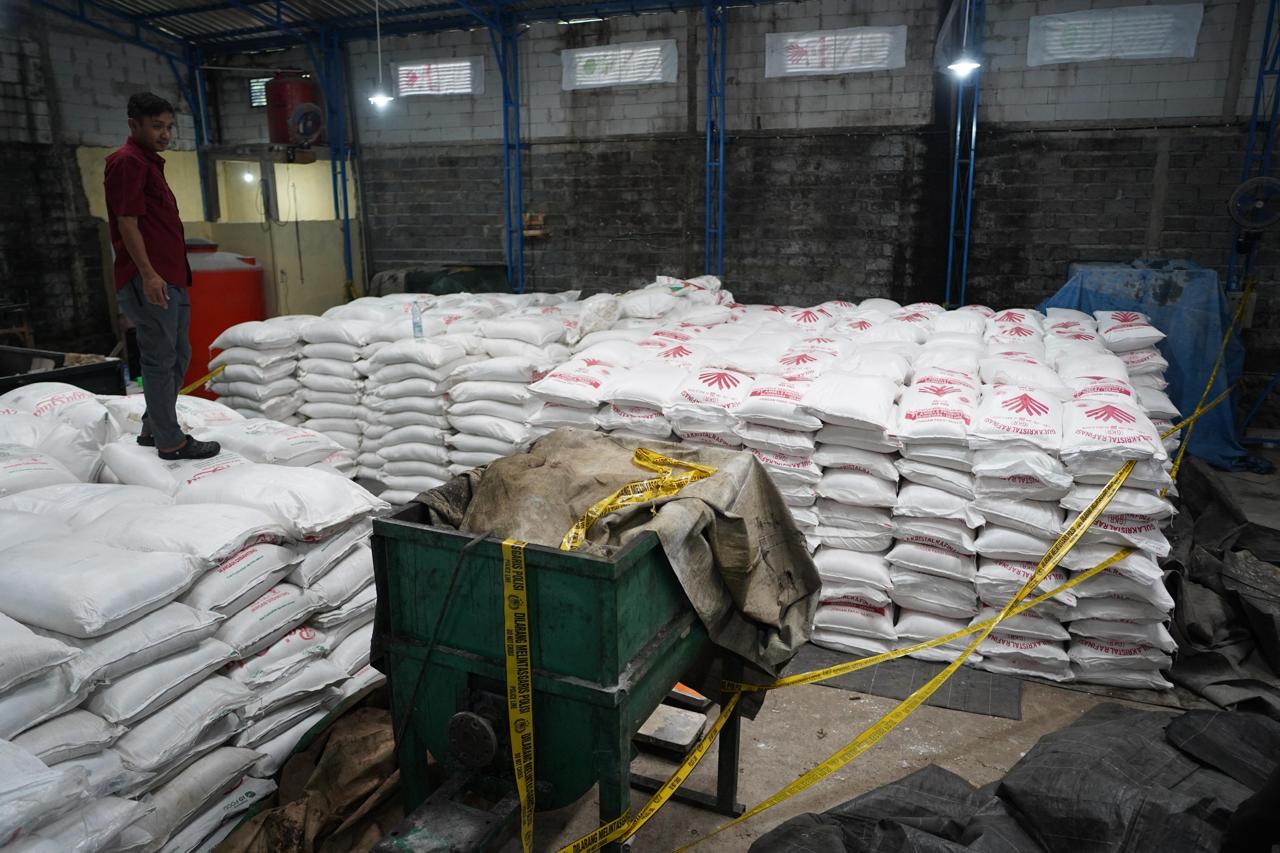 Jakarta. Polisi membongkar praktik gula oplosan yang tidak memiliki Standar Nasional Indonesia (SNI) di Banyumas, Jawa Tengah. Lebih dari 1.000 karung gula diamankan sebagai barang bukti.